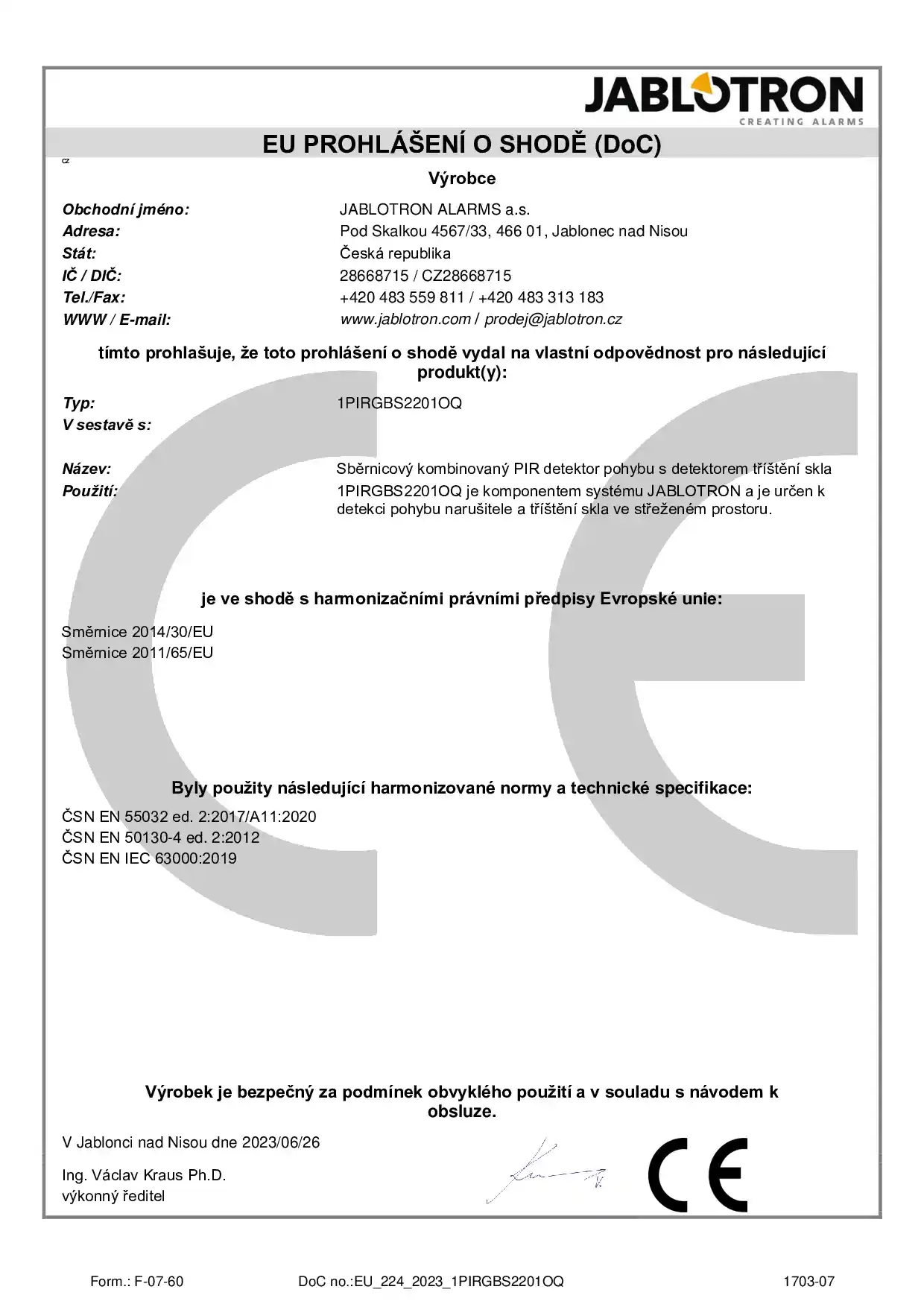 Výrobek je komponentem systému JABLOTRON. Slouží k prostorové detekci pohybu osob v interiéru budov a k detekci rozbití skleněných ploch tvořících plášť budov. Obsahuje dva nezávislé detektory.