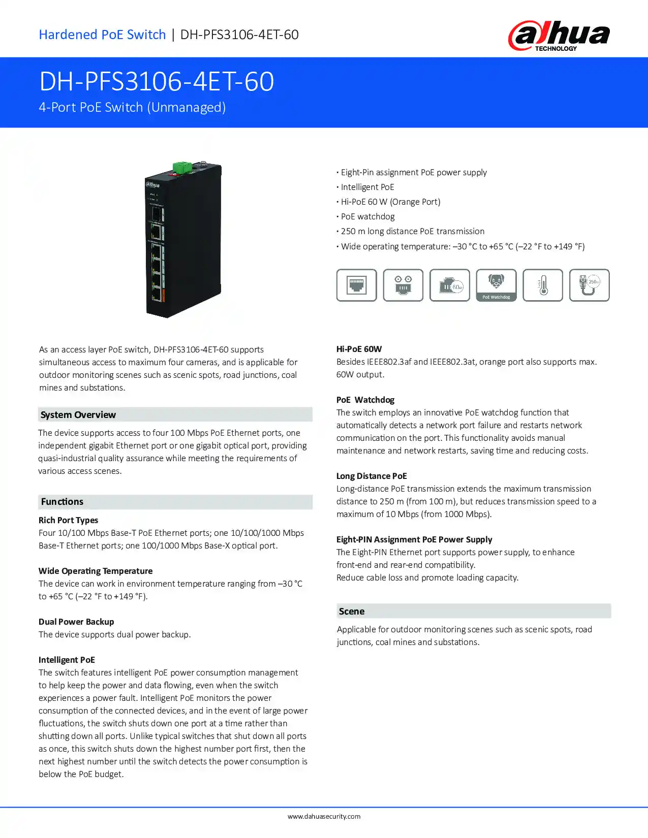 Dahua switch 4x 10/100 Mbps + 1x 10/100/1000 Mbps + 1x SFP 100/1000 Mbps, port 1 podpora Hi-PoE max. 60 W, porty 2-4 PoE (IEEE802.3af, IEEE802.3at) <30 W, celkem na všechny porty max. 60 W, PoE watchdog, Long Distance PoE, ochrana před přepětím 4 KV, napájení 48 - 57 V DC (zdroj je součástí balení), montáž na DIN lištu, pracovní teplota od -30 °C do +65 °C, hmotnost 0,45 kg.